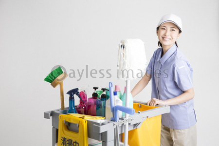 清掃カートを押す女性清掃員 商用利用可能な写真素材 イラスト素材ならストックフォトの定額制ペイレスイメージズ